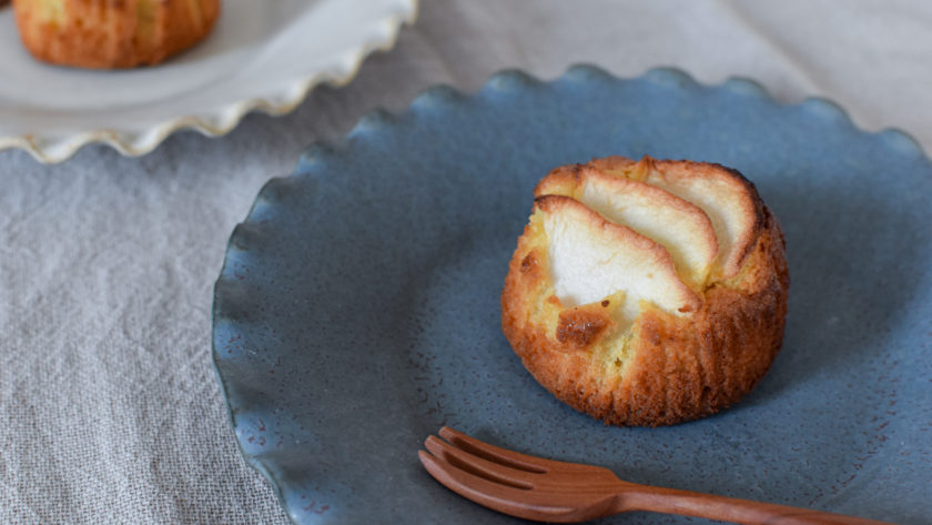 4.生地をカップに流し入れ、スライスしたりんごをのせ、オーブンで25分ほど焼く。
